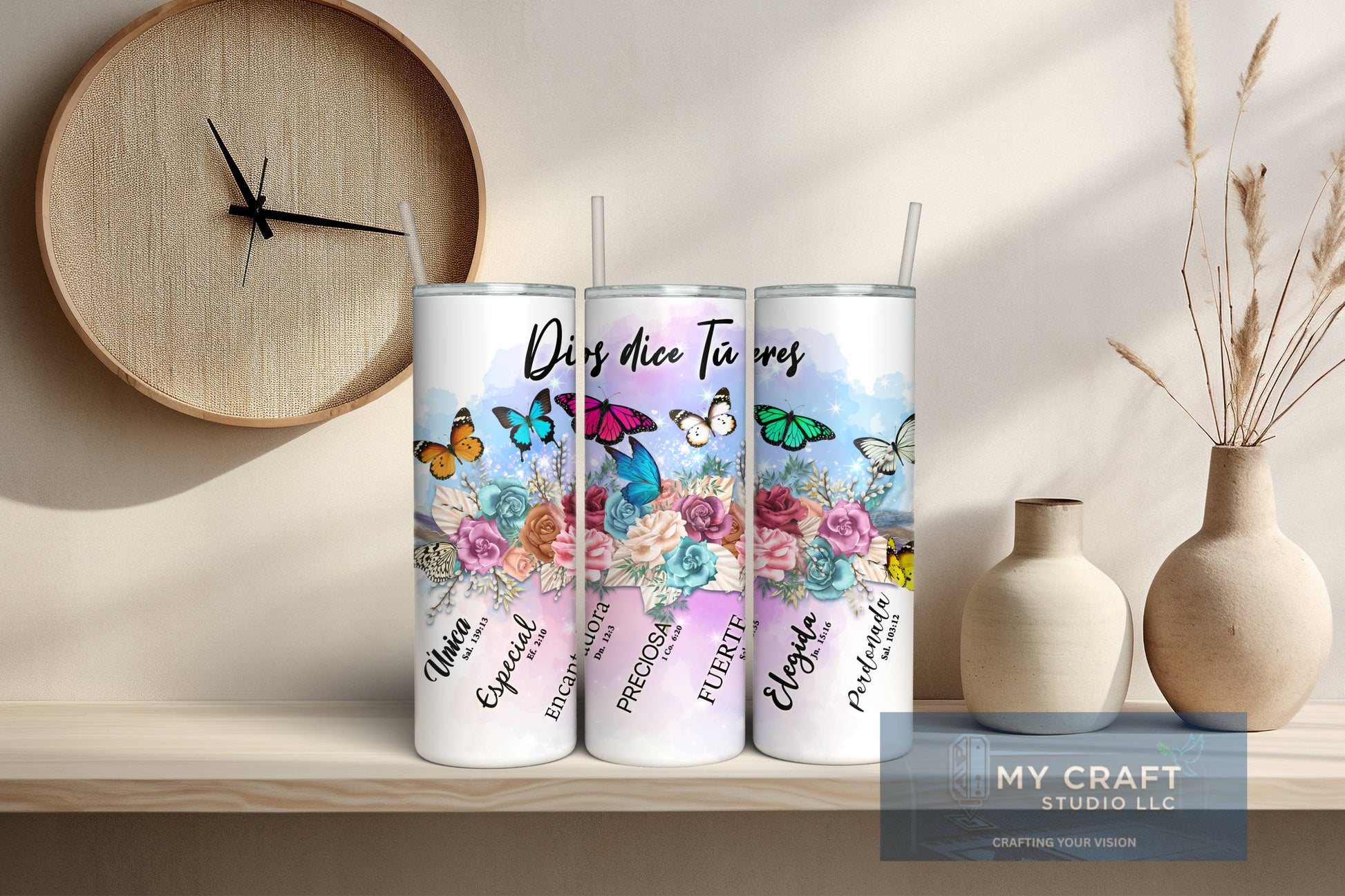Este hermoso vaso de 20oz es un recordatorio diario de tu valor en la fe. El diseño presenta la inspiradora frase "Dios dice Tú eres", junto a palabras como "Única," "Fuerte," y "Elegida," cada una respaldada por una cita bíblica. Adornado con vibrantes mariposas y flores en acuarela, es un vaso lleno de color y significado.